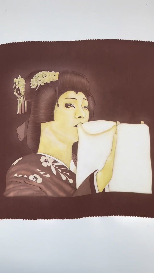 抜染画 染色補正の技術を活かし、染料を使わずに色を抜いて絵を描いています。 「染料の彫刻」とも言われて、色の抜き加減に強弱をつけることで絵が浮かび上がります。 今回は映画「国宝」の吉沢亮さんをモデルに制作しました。 #国宝 #映画国宝 #吉沢亮 #染色 #アート